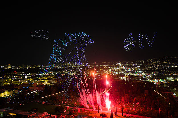 Stationed over Hollywood Forever Cemetery, the massive 1000’ x 1000’ formation — roughly the size of three football fields — was visible from up to three miles away in every direction. But this wasn’t just a sky spectacle. Designed to interact with the Hollywood landscape, the show positioned the Titans as if they had truly taken over Los Angeles, complete with pyrodrones simulating explosive moments like Godzilla unleashing his iconic atomic breath.